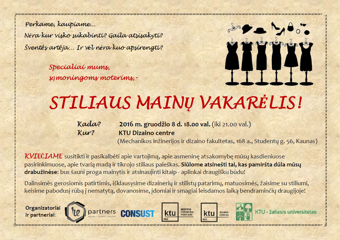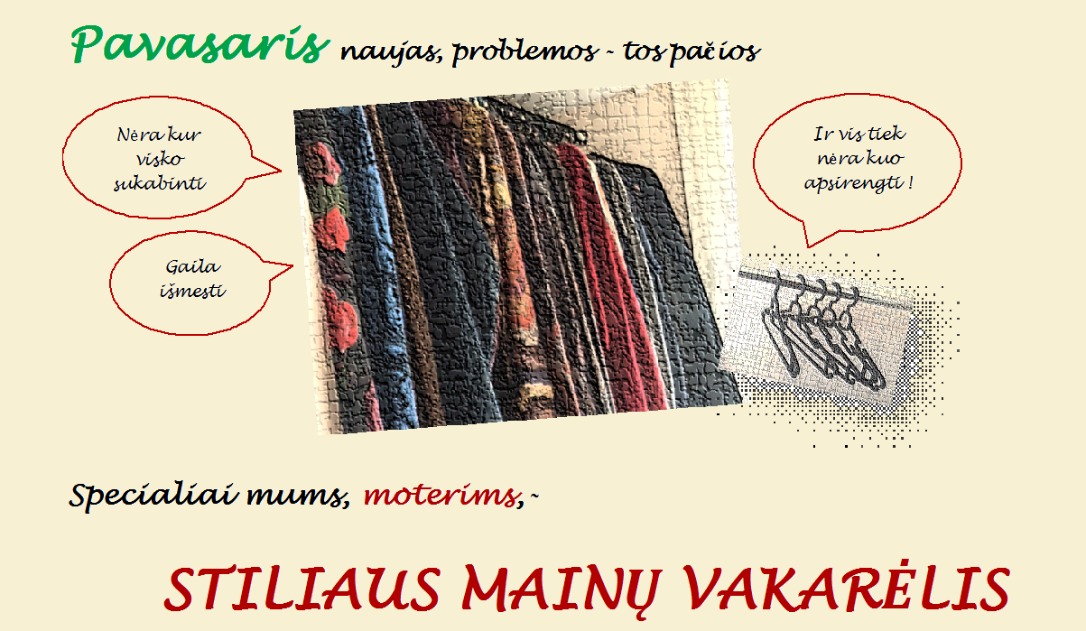 „KVIEČIAME įnešti daugiau gaivos ir spalvų į savo garderobą, pažaisti su stiliumi, išsikeisti pabodusį į nematytą, palaikyti sąmoningo vartojimo nuostatas, tiesiog įdomiai ir smagiai leidžiant laiką. Jūsų lauks jauki pavasariška, pokyčiams įkvepianti atmosfera, bendraminčių kompanija, galimybės matuotis naują stilių, konsultacijos tinkančio garderobo paieškai, moteriški pasiplepėjimai prie kavos puodelio, geros emocijos.„